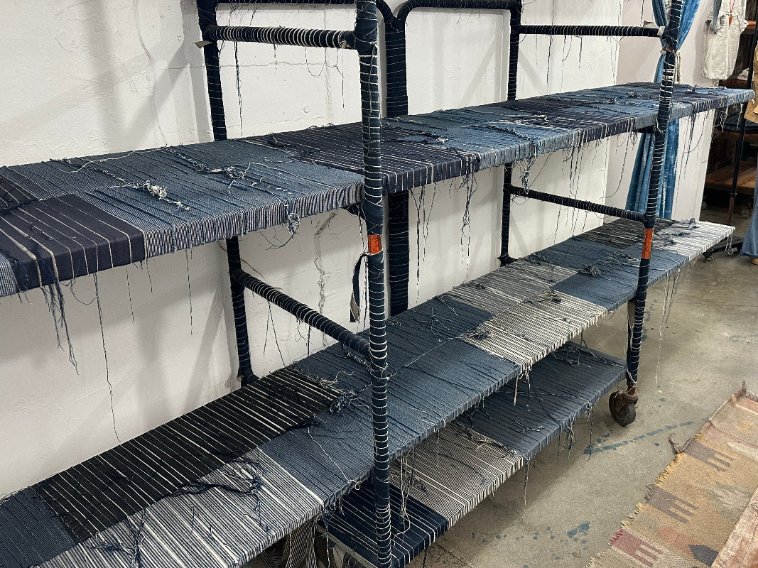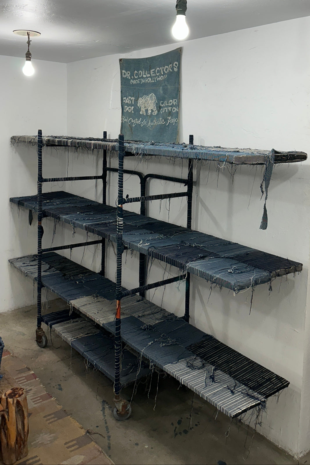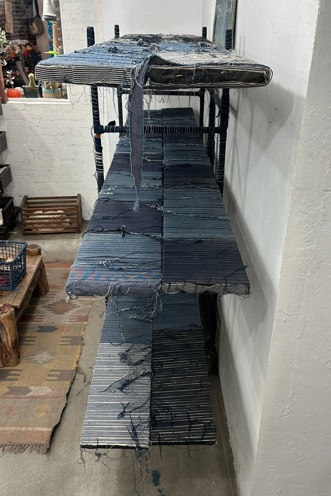 Vintage Hand Crafted Indigo Fabric Wrapped Scaffolding Shelving Unit on Casters.