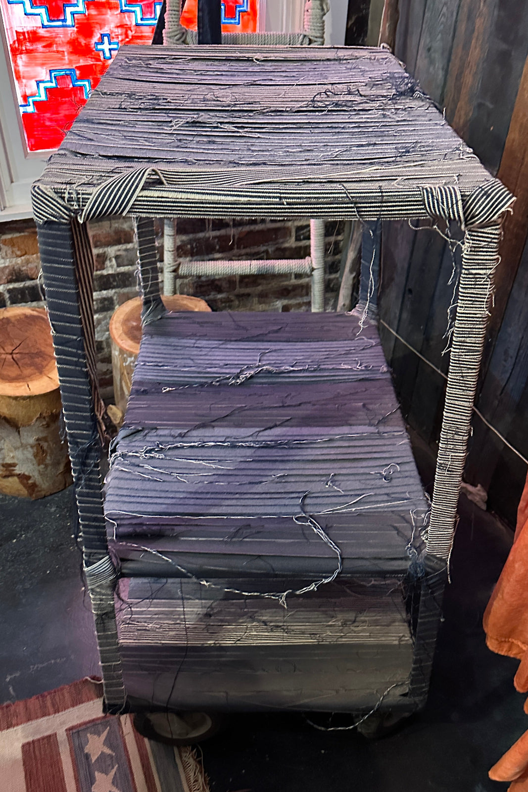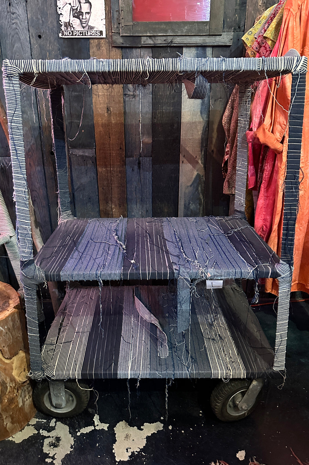 Vintage Handcrafted Indigo Fabric Wrapped Trolly Cart Shelving Unit on Casters.