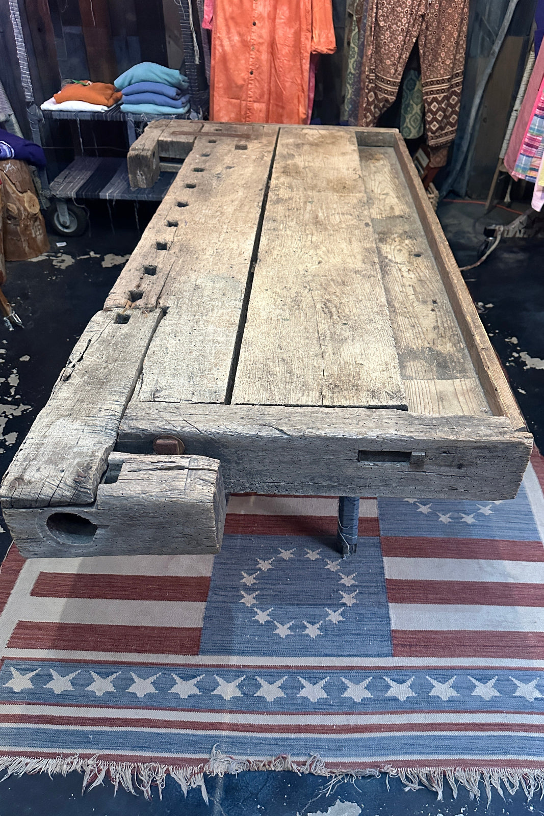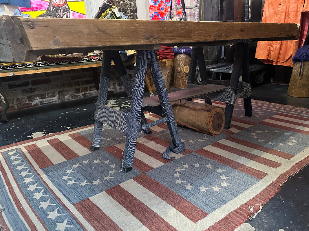 Vintage 1930's Large Wood Work Table. Hand Crafted Indigo Fabric Wrapped Sawhorse Support Bases.